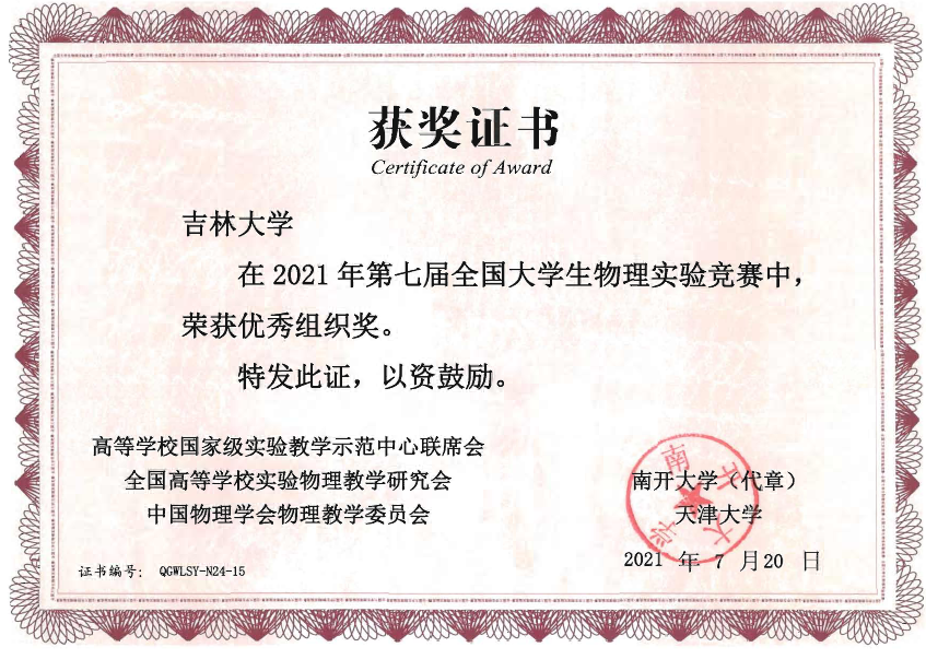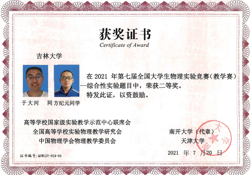 的4名本科生组成,他们在比赛中取得了佳绩:2019级本科生刘蟠菁获基础性实验一等奖,2019级本科生于大河、方纪元获综合性实验二等奖,2018级本科生刘垚汐获基础性实验三等奖,我校荣获竞赛优秀组织单位。
