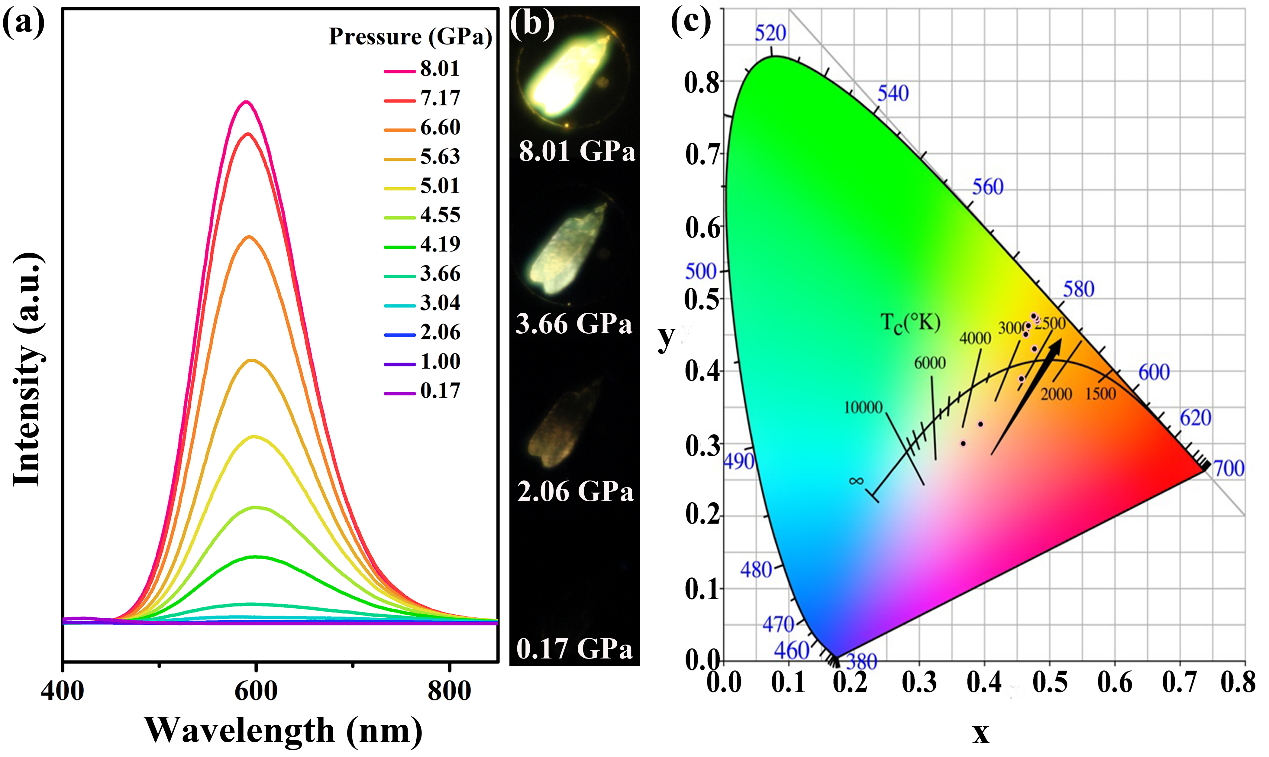 基于此,邹勃教授课题组提出了通过压力效应调控一维C4N2H14SnBr4八面体骨架的扭曲程度,从而改善内部激子自陷态发光性质的学术构想。进行了高压下荧光、吸收以及同步辐射实验的研究。发现压力可以成功诱导一维C4N2H14SnBr4发生结构相变,实现了八面体扭曲的有效调控,从而实现了一维 C4N2H14SnBr4的发光从0到1的突破,并随着压力的升高发光逐渐增强,根本原因在于压力下自陷态激子跃迁偶极矩的增加和自陷态激子结合能的增大。尤其在当压力升高到20 GPa时该样品仍然没有发生荧光的完全猝灭。该工作表明,高压可以调制结构从而增强物理化学功能,为低维卤素钙钛矿材料在压力传感、防伪以及信息储存等领域提供了很好的应用前景。