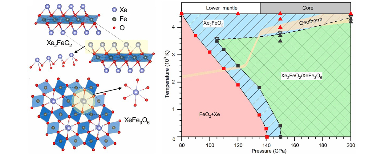 本研究利用马琰铭教授团队自主研发的CALYPSO结构预测方法(//www.calypso.cn/),首次预言了下地幔中存在氙气储存库,指出氙可与近期发现的下地幔矿物FeO2发生化学反应,生成稳定的氙铁氧化物—Xe2FeO2和XeFe3O6。下地幔密度和声速等关键数据的实验和理论对比显示,氙铁氧化物是可行的下地幔成分。系统的结构预测和热力学计算表明,FeO2不会与氩、氪和氖等其它惰性气体发生化学反应,并且下地幔的其它主要成分FeO、MgO、SiO2、CaO和Al2O3等氧化物也不能与氙气发生化学反应。如上数据证实了FeO2具有俘获氙的能力,也显示了氙可能是唯一以化合物形式存在于下地幔的惰性元素。该工作拓宽了氙化学的研究范围,丰富了下地幔的物质构成,表明了下地幔是氙气的理想藏身之所,为阐明“氙气消失之谜”提供了新的关键材料成分和物理机制。