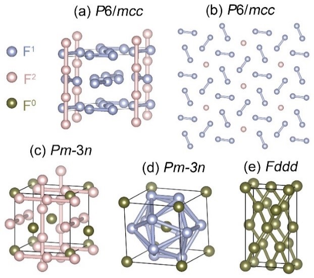 图1 理论预测超高压下氟的混合相和原子相的结构示意图。