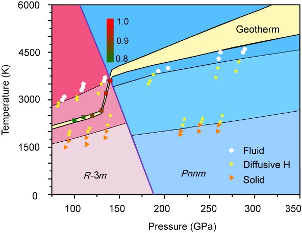 FeO2H2He在高温高压下的相图。黑色实线表示相边界;实心三角、五角星和圆分别表示固体、超离子态和流体;实心方块表示FeO2H2He的存在几率;黄色区域表示地球内部温压区域。