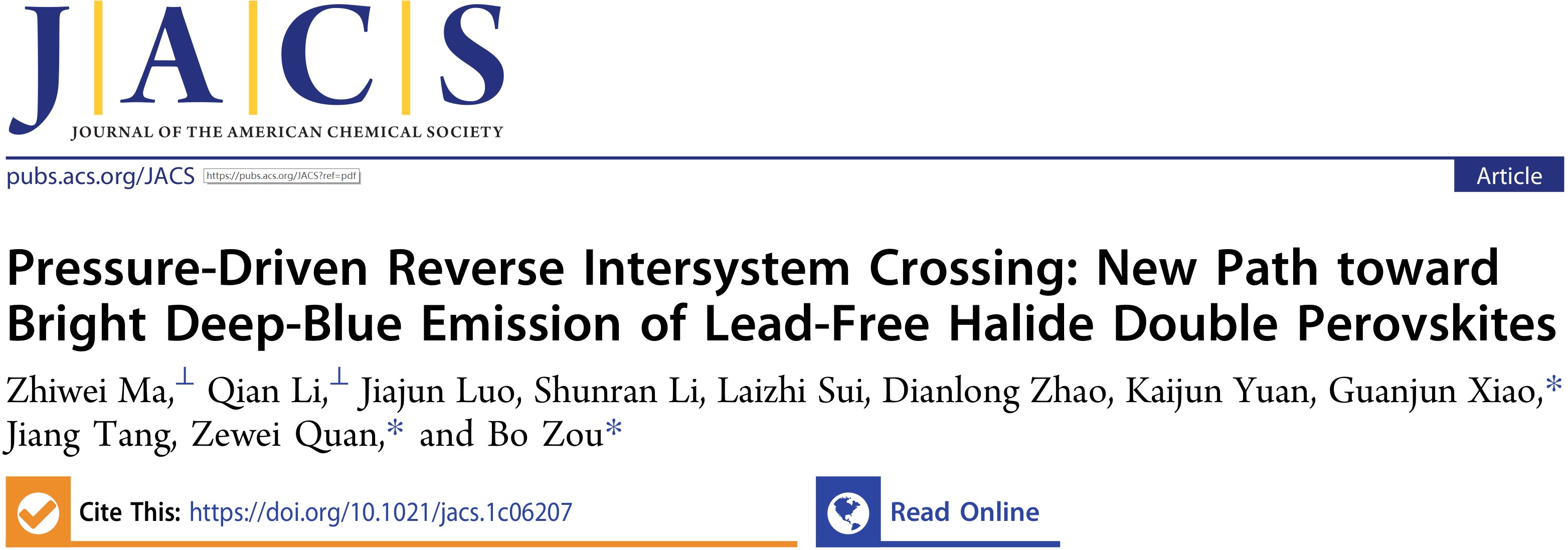 相关工作以“Pressure-Driven Reverse Intersystem Crossing: New Path towards Bright Deep-Blue Emission of Lead-Free Halide Double Perovskites”为题,发表在Journal of the American Chemical Society (DOI: 10.1021/jacs.1c06207)上。漫蛙