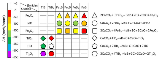 图1. 20 GPa下产生硼单质和金刚石的反应焓。图形颜色表示反应焓数值。三角形、圆形、正方形、菱形、五边形和六边形标记分别代表产生Fe3O4、FeO、Fe2O3、TiO2、TiO和Ti2O3的氧化还原反应。