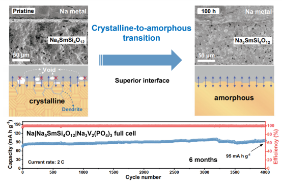 新型电池物理与技术教育部重点实验室杜菲教授、姚诗余副教授与北京高压科学研究中心唐明学研究员、剑桥大学陆子恒研究员合作在固态钠电池研究方面取得最新进展,相关成果以“Electrochemically induced crystalline-to-amorphization transformation in sodium samarium silicate solid electrolyte for long-lasting sodium metal batteries”发表于Nature Communications。