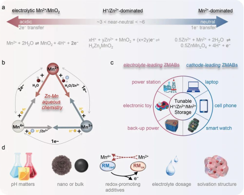 水系Zn-Mn电池(ZMABs)在文献中面临着容量波动和各种“前所未有的性能”等异常行为。由于电解质添加剂诱导的配合物,各种不同的充放电行为被报道。目前的性能评估仍然不规范,只考虑电极或电解质。ZMAB系统面临着缺乏全面和公正的性能评估协议的挑战,目前这正成为推动研究和商业化的障碍。课题组系统地讨论了基于不同储能机制的一系列性能指标,包括额定容量(Cr)和Mn2+电解液贡献率(CfM),确立了Mn(II)↔Mn(III)↔Mn(IV)转换化学和质子消耗/产生之间的关系,即质子偶联反应。最后,提出面向定制化应用场景的可调H+/Zn2+/Mn2+存储系统的具体设计理念,为下一代高安全可靠的储能系统打开大门。