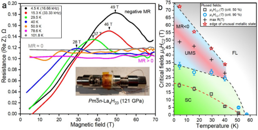 图:氢化物超导体A15-La4H23在强磁条件下的磁阻及超导相图