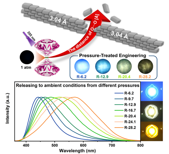 具有非芳香配体的互穿MOFs为气体吸附、催化和传感应用提供了独特平台。然而,由于非发射和缺乏光学性能可裁剪性,使得基于配体中心发射的非芳香互穿MOFs制造智能响应器件具有挑战性。高压作为独立于温度和化学组分的热力学参量,可以改变原子间的距离和电子轨道的重叠程度,从而有效调节物质内部原子间的相互作用,诱发许多常压下未曾出现的新结构和新性质。因此,高压技术是发现和获得具有奇异性质的新型材料的重要手段。在前期工作中,针对基于芳香羧酸为配体的MOFs材料,邹勃团队杨新一课题组创新性提出利用压强处理工程和氢键协同效应锁住共轭构型并提高相变势垒,成功在环境条件下实现Tb(BTC)(H2O)6的绿色荧光增强,将其荧光量子产率从初始的50.6 %显著提高到90.4 % (Angew. Chem. Int. Ed. 2022, 61, e202210836)。进一步又利用压强处理工程和氢键协同效应提高氢键结合能并锁住平面构型,成功在环境条件下实现Y(BTC)(H2O)6的蓝色荧光增强,将其荧光量子产率从初始的2.8 %显著提高到75.0 % (Adv. Funct. Mater. 2023, 33, 2300109)。最近,利用压强处理工程和氢键协同效应有效地提高了有机配体的旋转势垒,成功实现了不发光的MOF-2高效荧光发射,并成功将高荧光态“截获”至常压,其荧光量子产率高达70.4 % (Adv. Mater. 2023, 35, 2211729)。然而,针对于不发光的非芳香配体基MOFs,通过压强处理工程,在环境条件下实现发光,一直是团队所追求的目标。此外,利用压强处理实现不同发射颜色的“截获”对于发光材料领域具有重要意义。