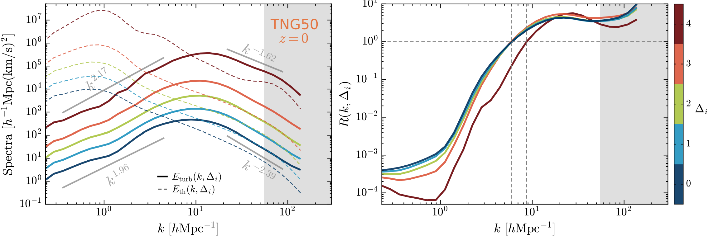 图二. 左:红移0时期的环境依赖湍流能谱(实线)与热能谱(虚线)。右:湍流能谱与热能谱之比。