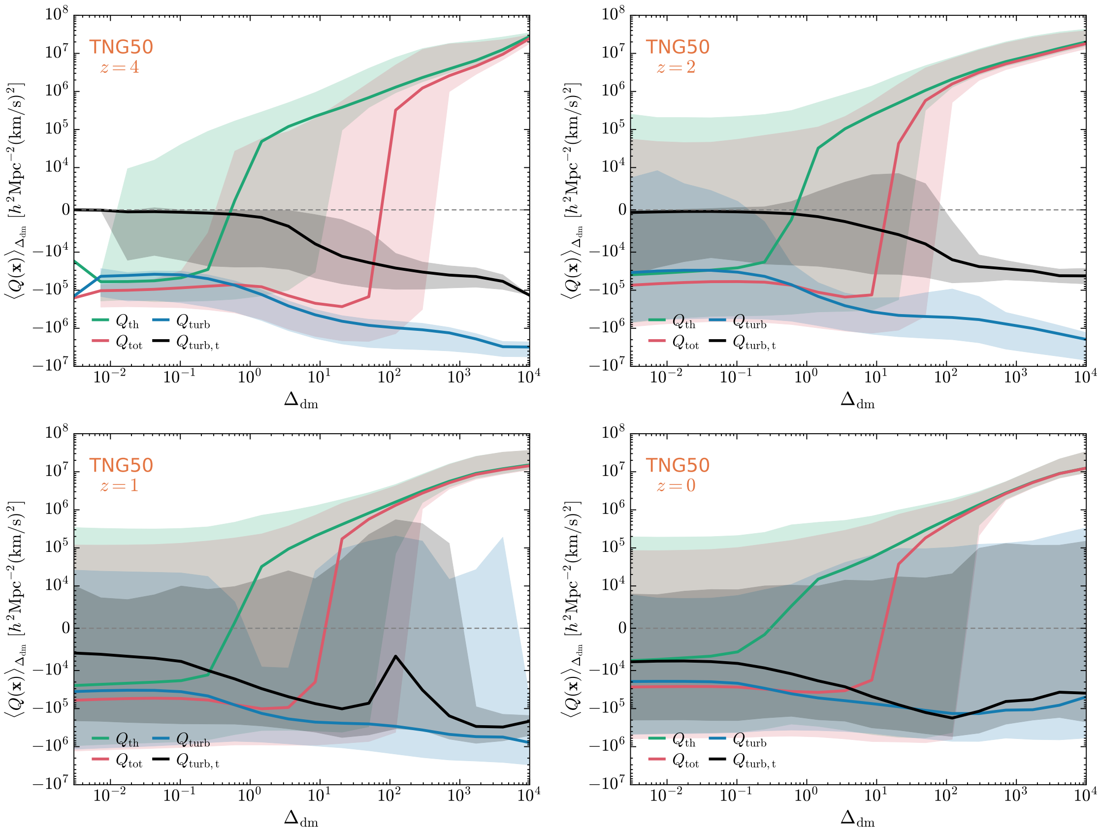 近几十年来,宇宙大尺度结构中重子流体的湍动性质受到越来越多的关注,成为了宇宙学的研究热点。在本工作中,研究人员基于连续小波变换设计了全局和环境依赖的能谱 (global and environment-dependent energy spectra),并用其检验了世界上最先进的宇宙流体动力学模拟项目IllustrisTNG的重子速度场的湍动和热动性质。结果显示,在红移4到2时期,湍流压强谱出现小幅增大;而从红移2到1,在大尺度上湍流能谱的幅值显著增大,表明湍流逐渐注入重子流体;从红移1到0,湍流能谱几乎保持不变,表明湍流可能通过能量转移和耗散达到平衡 (图一)。 此外,湍流能谱幅值也随着环境密度的增大而增大,在最高密度区域,湍动压强达到了热压强的六倍(图二)。