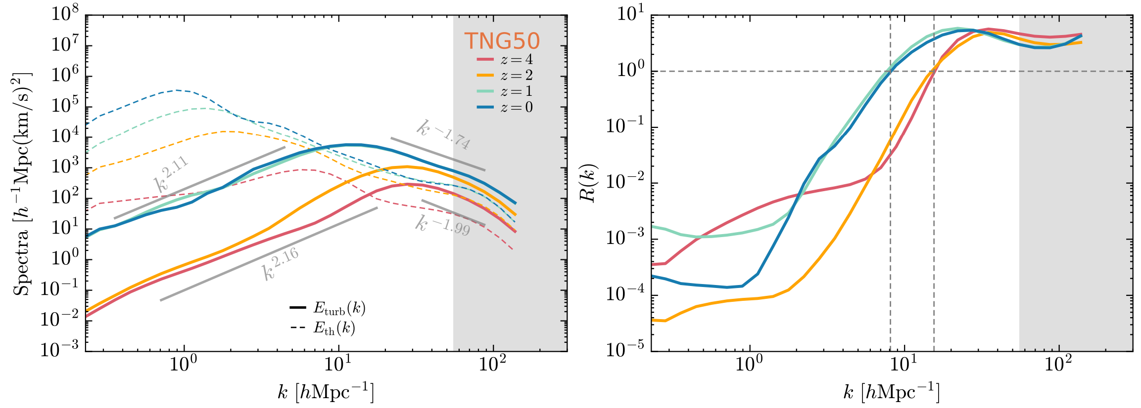 图一. 左:全局湍流能谱(实线)和热能谱(虚线)的红移演化。右:湍流能谱与热能谱之比。