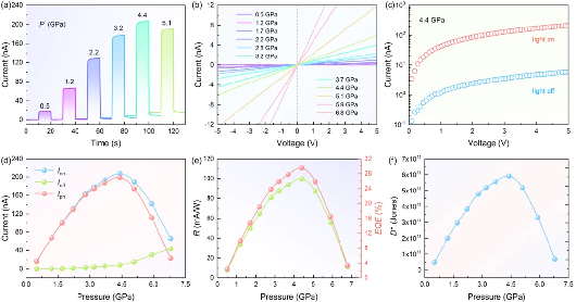图2. 520nm激光照射下,高压下SbI3 的光电性能。(a) 外加偏压5V时,不同压力下SbI3的光电流曲线。(b)无光照时不同压力下SbI3的I-V曲线。(c)4.4GPa时,SbI3在有光和无光条件下的I-V曲线。(d) 总电流(Ion)、暗电流(Ioff)和光电流(Iph)与压力演化的关系。(e-f)SbI3的响应度(R)、外量子效率(EQE)和比探测率(D*)与压力的演化关系。