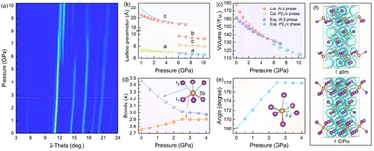 图 1. 压力诱导SbI3分子-离子等结构相变。(a) SbI3的高压同步辐射XRD。(b-c)SbI3晶格参数和化学式单位体积与压力的演化趋势。(d-c) 计算的R-3相SbI3中Sb-I 键长和I-Sb-I键角与压力的变化。(f) 选定压力下R-3相SbI3的电子局域函数(ELF,ELF = 0.5)。