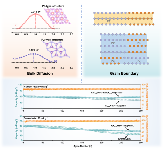 在本研究中,杜菲教授团队提出了一种双相结构共生的P2/P3-K0.62Mg0.54Sb0.46O2氧化物电解质,通过精确调控P2与P3两种相结构的异质性与互惠性,实现了25°C下1.6×10⁻⁴ S cm⁻¹的高离子电导率,超越了此前报道的同构材料。首先分析并对比了钾离子在两种晶体结构中的传导机制: 结合理论计算与实验测量结果,发现P2相结构中原子的堆叠方式能够降低钾离子迁移势垒,从而提高体相电导率。其次,在高温驱动的P2-P3相转变过程中,后形成的P2相会依附于领先相P3表面析出, 促使两相之间相互依附、拼接生长。因此,P2和P3质量比为52:48的K0.62Mg0.54Sb0.46O2呈现出数十微米长的棒状形貌,缓解了晶界对于离子长程运输的阻碍,将晶界导电率提升了一个数量级。基于该固态电解质组装的固态钾金属对称电池在0.1 mA cm⁻² 的电流密度下能够稳定循环300小时,临界电流密度达到0.68 mA cm⁻²。采用两种层状氧化物正极材料分别组装了准固态钾金属全电池,它们在300次循环后的容量保持率皆超过了使用商用有机电解液的液态电池,为高效、安全且持久的规模化储能带来新机遇。