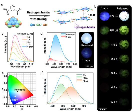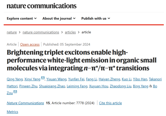 朱品文教授、刘兆东教授和杨兵教授、中国工程物理研究院房雷鸣研究员等人合作,利用压强处理工程和氢键协同效应,在不含重原子的有机小分子间苯二甲酸(IPA)材料中点亮三重态激子,提高磷光效率和寿命,实现高效荧光/磷光混合型白光发射。相关成果以“Brightening triplet excitons enable high-performance white-light emission in organic small molecules via integrating n-π*/π-π* transitions”为题发表在《Nature Communications》(Nat. Commun. 2024, 15, 7778)上。