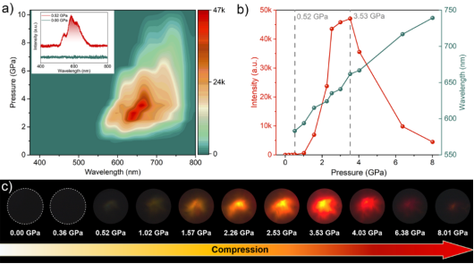 有机发光材料结构丰富、分子设计灵活、性能优异,一直是材料领域研究的焦点。如何提升固态荧光效率是有机发光材料研究的重大科学问题。压力作为独立的热力学参量,能够有效调控分子间相互作用,进而获得新结构和新性质。压强诱导发光这一新奇现象就是典型范例,能够通过高压实现不发光材料“从无到有”的荧光激活,已先后在卤素钙钛矿材料和金属有机框架材料中得到验证,为探索新型发光材料提供了有效途径。遗憾的是,在有机材料中实现“从无到有”PIE的研究尚属空白。对此,研究者基于偶氮苯衍生物分子开展了高压研究。偶氮苯具有独特的光致顺反异构特性,被广泛应用于智能材料领域。但光致异构与辐射跃迁竞争激发态能量,从根本上严重限制了偶氮苯的发光性能。如何实现偶氮苯高效发光一直是公认的科学难题。