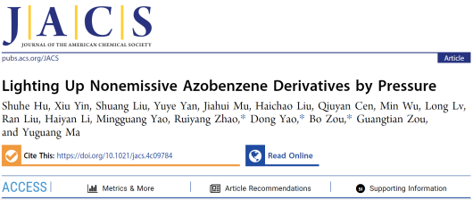 超硬材料国家重点实验室邹勃教授联合超分子结构与材料国家重点实验室姚栋副教授、青岛科技大学赵瑞阳教授,首次在有机材料中实现了“从无到有”的压强诱导发光(PIE)。该成果以“Lighting Up Nonemissive Azobenzene Derivatives by Pressure”为题,发表于《美国化学会志》(J. Am. Chem. Soc. 2024, 10.1021/jacs.4c09784)。该工作得到了超硬材料国家重点实验室邹广田院士和华南理工大学马於光院士的悉心指导与支持,还得到漫蛙