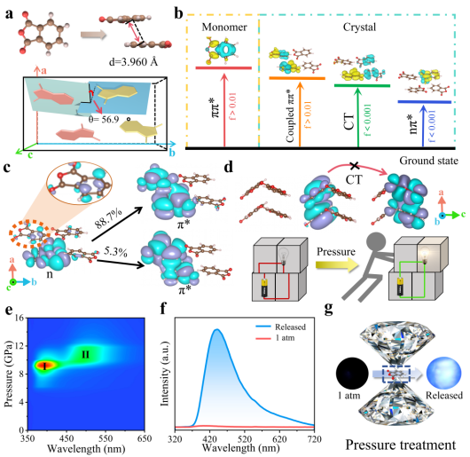 在本研究中,杨新一课题组选择初始不发光的邻苯二甲酸酐(PA)晶体作为研究对象,通过压强诱导分子重排调控其晶体结构,成功实现了PA晶体明亮蓝光发射,其色坐标为(0.20, 0.19),量子产率达到15.7%。原位高压同步辐射X射线衍射、红外吸收光谱和密度泛函理论计算表明:在压强处理过程中,PA晶体发生了从正交相到三斜相的相变。三斜相的PA晶体表现出增强的非键相互作用,促进了激子弛豫过程中的分子转动,导致分子堆积构象的平面化。这一平面化特征改变了激发态能级的排列,打开了电荷转移(CT)通道,产生基于CT态的发射。此外,压强处理后增强的非键相互作用与分子耦合振动产生了协同效应,显著提高辐射跃迁速率,抑制非辐射耗散,实现PA晶体的明亮蓝光发射。本研究展示了利用压强工程实现激活刚性平面分子固态发射的可行性,为赋予初始无荧光有机分子光功能提供了新思路。