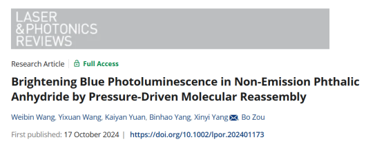 超硬材料国家重点实验室邹勃团队杨新一课题组利用高压诱导分子重排触发初始无荧光邻苯二甲酸酐的高效蓝光发射,其荧光量子产率达到了15.7%。这是继邹勃团队率先实现有机材料的压强诱导发射(PIE)(J. Am. Chem. Soc. 2024, 146, 28961–28972)后,又一次实现有机材料PIE,并首次“截获”有机PIE材料的高荧光态至常压。相关研究成果以“Brightening Blue Photoluminescence in Non-Emission Phthalic Anhydride by Pressure-Driven Molecular Reassembly”为题发表在国际学术期刊《Laser & Photonics Reviews》上。