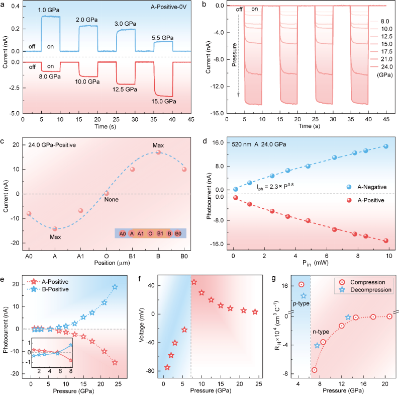 图1:压力诱导BiI3的p-n导电类型切换导致自驱动光电流的极性反转
