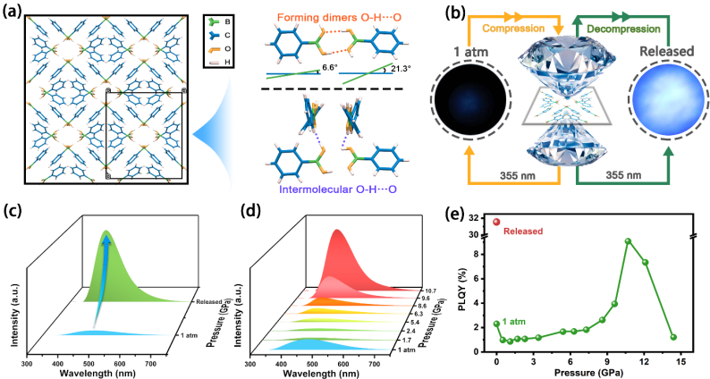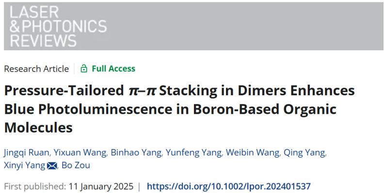 高压与超硬材料全国重点实验室邹勃教授团队杨新一课题组通过压强处理工程调控分子堆叠模式实现了苯硼酸(PBA)的高效蓝光发射,其荧光量子产率由初始的2.3%提高到了31.5%。相关研究成果以“Pressure-Tailored π-π Stacking in Dimers Enhances Blue Photoluminescence in Boron-Based Organic Molecules”为题发表在国际学术期刊《Laser & Photonics Reviews》上。