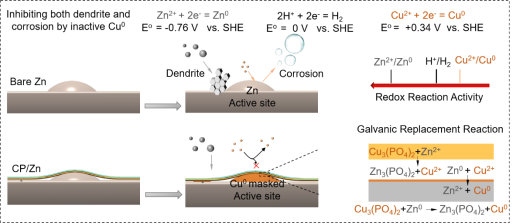 目前,针对锌负极稳定性的改善策略包括优化电解液体系以及负极表面钝化处理等。然而,这些策略通常无法同时解决锌表面活性位点高活性所带来的副反应问题以及电解液界面的亲水性问题,难以从根本上提升锌负极的综合性能。此外,传统的表面钝化方法往往缺乏选择性,对活性位点的抑制效果有限,且易导致界面电阻增加,影响锌离子的传输动力学。开发兼具选择性钝化与界面疏水功能的新型保护层存在挑战。