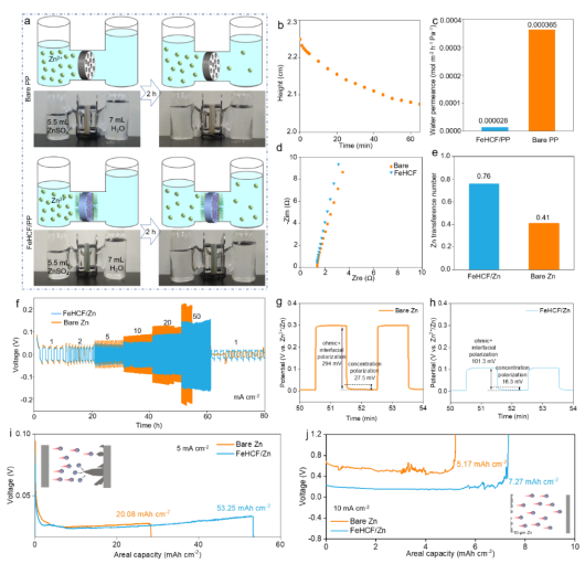 图1. FeHCF纳米膜的阻水与锌离子传导性能