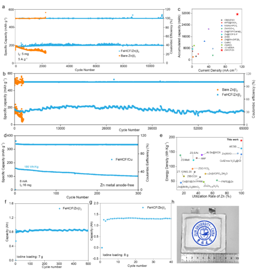 在实际电池测试中,该纳米膜显著提升了全电池的性能。采用 FeHCF/Zn 负极的 Zn||I2电池在 5 Ag-1的高电流密度下可稳定循环 10,000 次,容量保持率远高于裸锌电池。此外,在 109 mA cm-2(150C 倍率)极端工况下,该电池实现了 65,000 次超长循环寿命,累积容量达 31,319 mAh(图 2)。研究团队进一步组装了 Ah 级软包电池,以验证该技术的可扩展性。FeHCF/Zn 软包电池在 0.84 Ah放电容量下可稳定循环 500 次,在 1.31 Ah 放电容量下也能维持 40 余次循环,展现出优异的稳定性。这项研究为水系锌电池的长期稳定运行提供了新的界面调控策略。通过消除界面水层并优化 Zn2+ 传输,FeHCF 纳米膜不仅有效提高了电池的循环寿命,还为将来可能的储能应用提供了可靠的技术支撑。