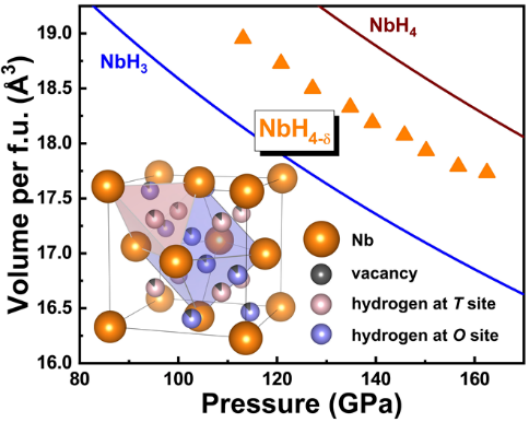 图1. 非化学计量比NbH4-δ的压缩状态方程和晶体结构示意图。