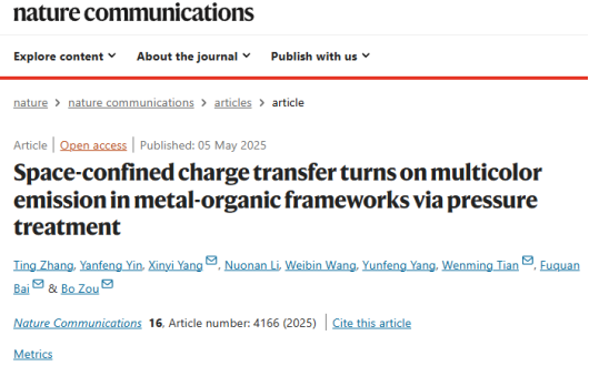 化学学院白福全教授等人合作,在金属-有机框架(MOFs)材料的多色可调荧光/磷光领域取得重要突破。通过压强工程调控镉基金属-有机框架(MOFs)材料的电荷转移动力学,实现单组份MOFs材料Cd(BDC)(DMF)的高效多色可调荧光/磷光发射。相关成果以“Space-Confined Charge Transfer Turns on Multicolor Emission in Metal-Organic Frameworks via Pressure Treatment”为题发表在《Nature Communications》(Nat. Commun. 2025, 16, 4166)上。