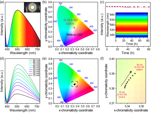 值得注意的是,经过高压处理后的样品在25分钟内激光持续照射下表现出反常的光活化发光增强行为,并在停止照射后保持发光强度稳定不变。压强处理诱导材料形成致密刚性结构,显著增强电荷局域化效应。在常压条件下,载流子扩散范围较大导致电子-空穴空间重叠概率较低,激子形成效率受限。高压处理后,无机八面体畸变与氢键网络重构协同抑制载流子长程迁移,使电子-空穴在局域化区域内更易形成高密度激子。激光照射时,强电子-声子耦合效应有效稳定局域激子态,提升辐射复合几率,促使产生光活化现象。此外,借助大腔体压机的冷压宏量样品合成,进一步探索了高压处理后二维杂化卤化物(C7H7N2)2PbCl4在光发射二极管pc-LEDs领域的潜在应用,展现出高质量白光发射和良好的稳定性。