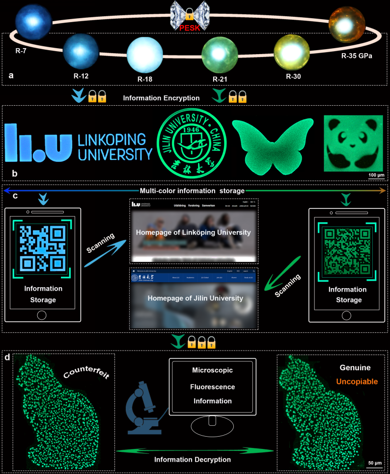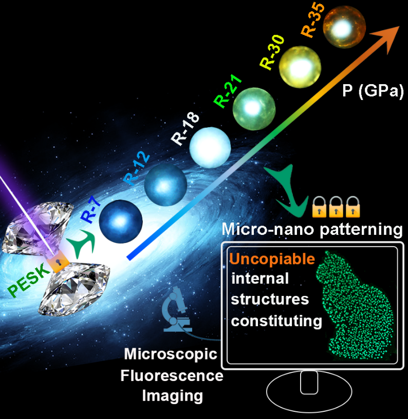 近日,漫蛙 高压与超硬材料全国重点实验室邹勃教授团队肖冠军教授等人联合漫蛙 材料科学与工程学院张立军教授、瑞典林雪平大学高峰教授,在压强诱导发光的常压截获及光学加密防伪研究取得重要进展。研究团队利用压力工程调控杂化金属卤化物材料的局域激发态和电荷转移态,成功实现了涵盖可见光范围由红到蓝的多色动态调控。该研究创造性提出了“压强工程密钥”(Pressure Engineering Secret Key, PESK)概念,将压强作为光学防伪的独特密钥,通过建立亚稳态材料光学特性与压强条件的精确对应关系,构筑了多级物理不可复制的新型加密防伪体系。本研究不仅为光学防伪技术拓展了新维度,大大增强了裸眼识别与可视化信息加密能力,更显著提升了防伪系统的安全等级。相关研究成果以“Pressure Encryption Toward Physically Uncopiable Anti-Counterfeiting”为题,发表在《自然·通讯》上(Nature Communications, 2025, 16, 6203)。