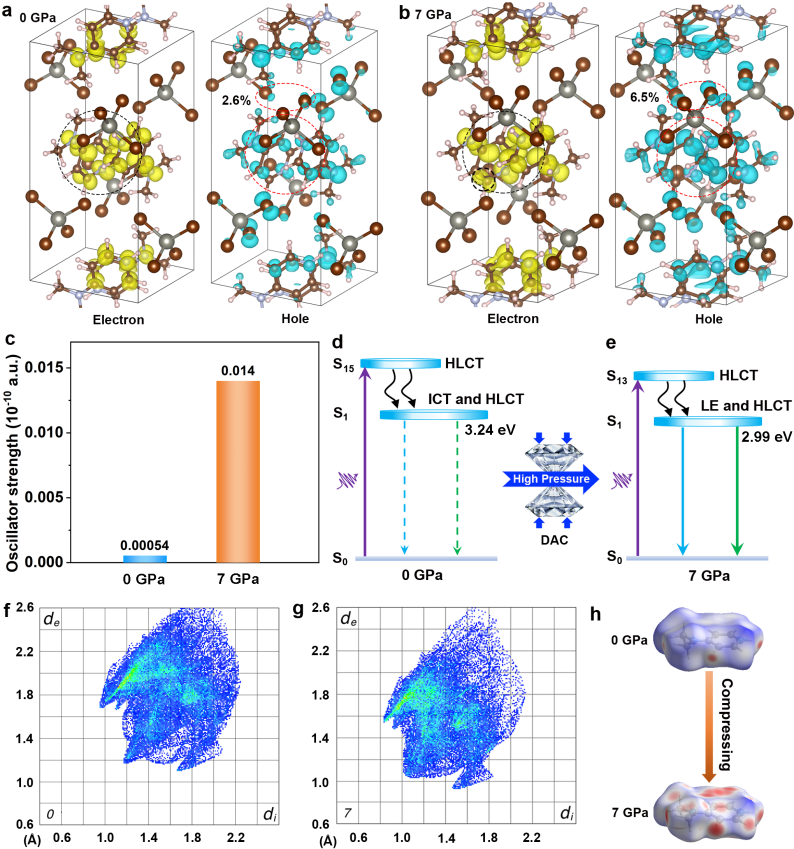 2、高压下(4DMAP)2ZnBr4的电子和空穴波函数、谐振子强度以及Hirshfeld表面分析和2D指纹图。