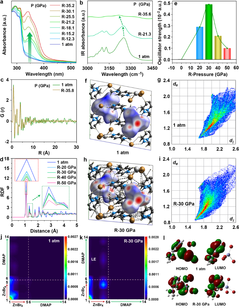 3、不同压强处理(4DMAP)2ZnBr4后的吸收光谱、红外光谱、振子强度、径向分布函数、Hirshfeld表面分析和跃迁密度矩阵。