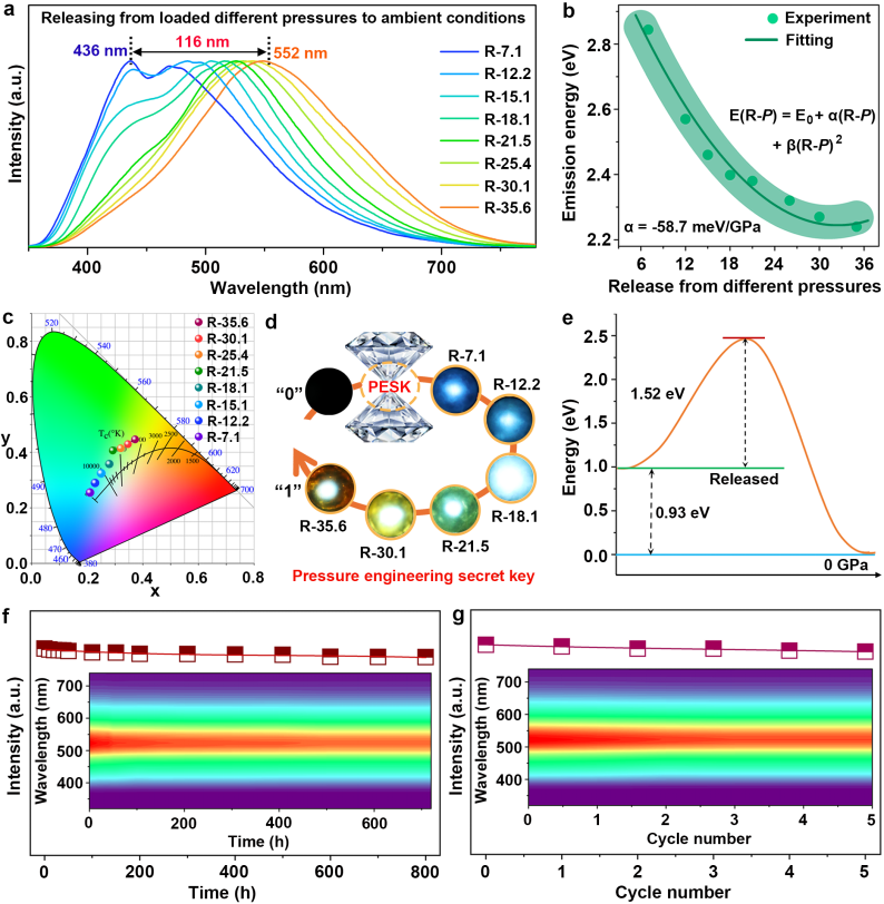 本研究设计并高压合成了一种新型低维有机-无机杂化金属卤化物材料(4DMAP)2ZnBr4,该材料巧妙整合了有机和无机组分的发光特性。值得注意的是,该材料在常压下呈现“暗态”特征(发光极弱),而通过精确压力调控可激活其多色发光特性。实验研究表明,在不同压强刺激下,实现了(4DMAP)2ZnBr4从初始不发光的“暗态0”到高压下及卸压后发光的“亮态1”的开光行为转变,发射颜色呈现连续可调的渐变特征,覆盖深蓝至橙红的宽色域范围。本研究首次提出了“压强工程密钥”(Pressure Engineering Secret Key, PESK)的新概念,为先进光学加密技术开辟了新途径:通过精确控制压强参数来调控材料中不同发射峰的比例,实现了单一材料的多色压强诱导发光(PIEgens)。