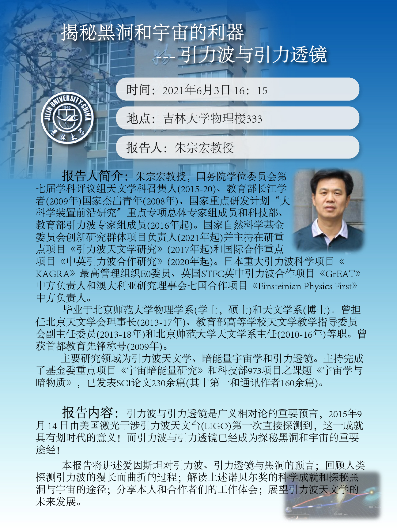 报告题目:揭秘黑洞和宇宙的利器 -- 引力波与引力透镜