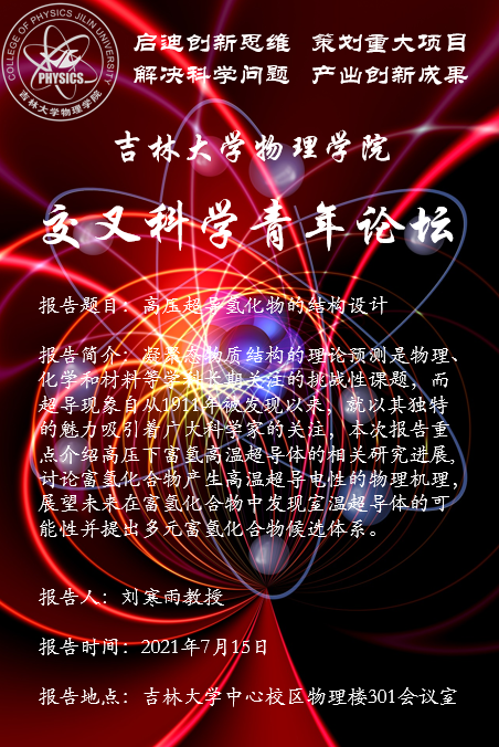 凝聚态物质结构的理论预测是物理、化学和材料等学科长期关注的挑战性课题。基于粒子群多目标优化算法的卡里普索(CALYPSO)结构预测方法和软件,现已成为国际结构预测领域的重要方法和工具。超导现象自从1911年被发现以来,就以其独特的魅力吸引着广大科学家的关注。实现室温超导和其应用是人们不懈的追求目标。经过一个世纪的超导研究,但是常规BCS超导体的最高临界超导温度一直停留在MgB2中的39K。近年来, 高压强极端条件下的富氢化合物成为高温超导体研究的热点目标材料体系. 该领域目前取得了两个标志性重要进展, 先后发现了共价型H3S富氢超导体(Tc = 200 K)和以LaH10(Tc = 260 K, –13 ℃), YH6, YH9等为代表的一类氢笼合物结构的离子型富氢超导体, 先后刷新了超导温度的新纪录。这些研究工作燃发了人们在高压下富氢化合物中发现室温超导体的希望。本次报告重点介绍高压下富氢高温超导体的相关研究进展, 讨论富氢化合物产生高温超导电性的物理机理,展望未来在富氢化合物中发现室温超导体的可能性并提出多元富氢化合物候选体系。