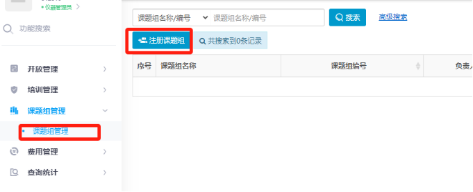 2. 点击课题组管理,搜索课题组名称,如果未找到课题组,则需注册课题组。