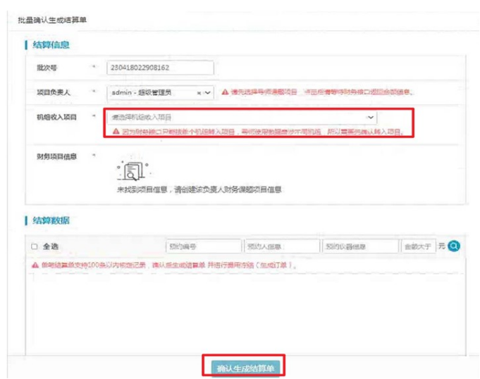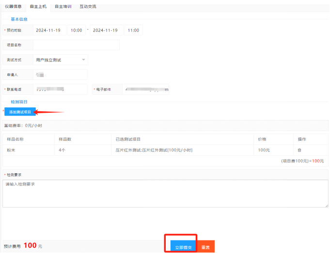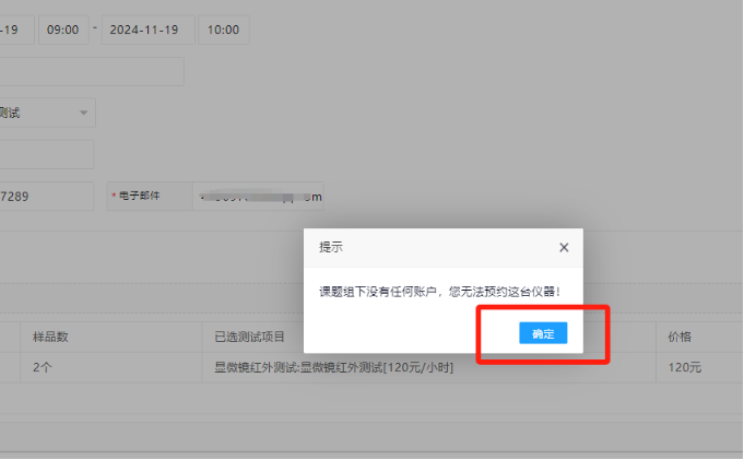 注意:基本信息中的导师信息填写时,如果导师没有申请自己的课题组并添加相应的付款项目,而在项目名称栏中手动填写项目名称,在点击立即提交后,会出现以下提示。因此,在预约前需要用指导教师账号申请课题组并添加相应的项目名称。相应流程见补充操作1。
