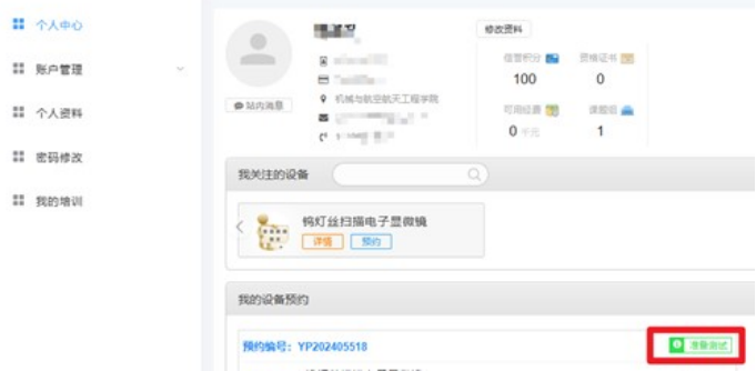8.管理员通过后,可登陆预约人的账号,查看预约进展。当显示为准备测试时,可按照预约时间进行测试。