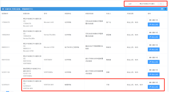 3. 在搜索框中搜索需要用到的设备,这里以傅立叶变换红外光谱仪第一项压片红外测试为例,选择自主上机。