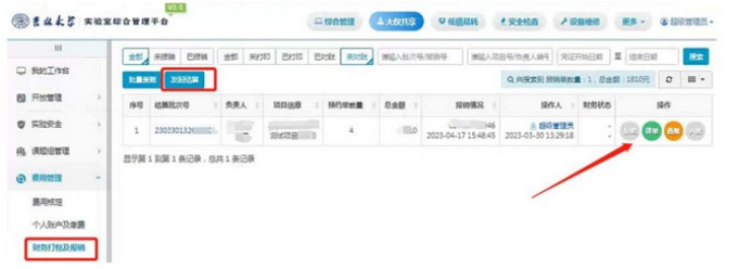12.点击费用管理,进入财务打包及报销,右边会显示已完成核定的相关预约信息。如果没有显示相应结算信息,点击发起结算按钮进行财务结算,之后点击报销按钮,进入下一级界面就可以报销操作。