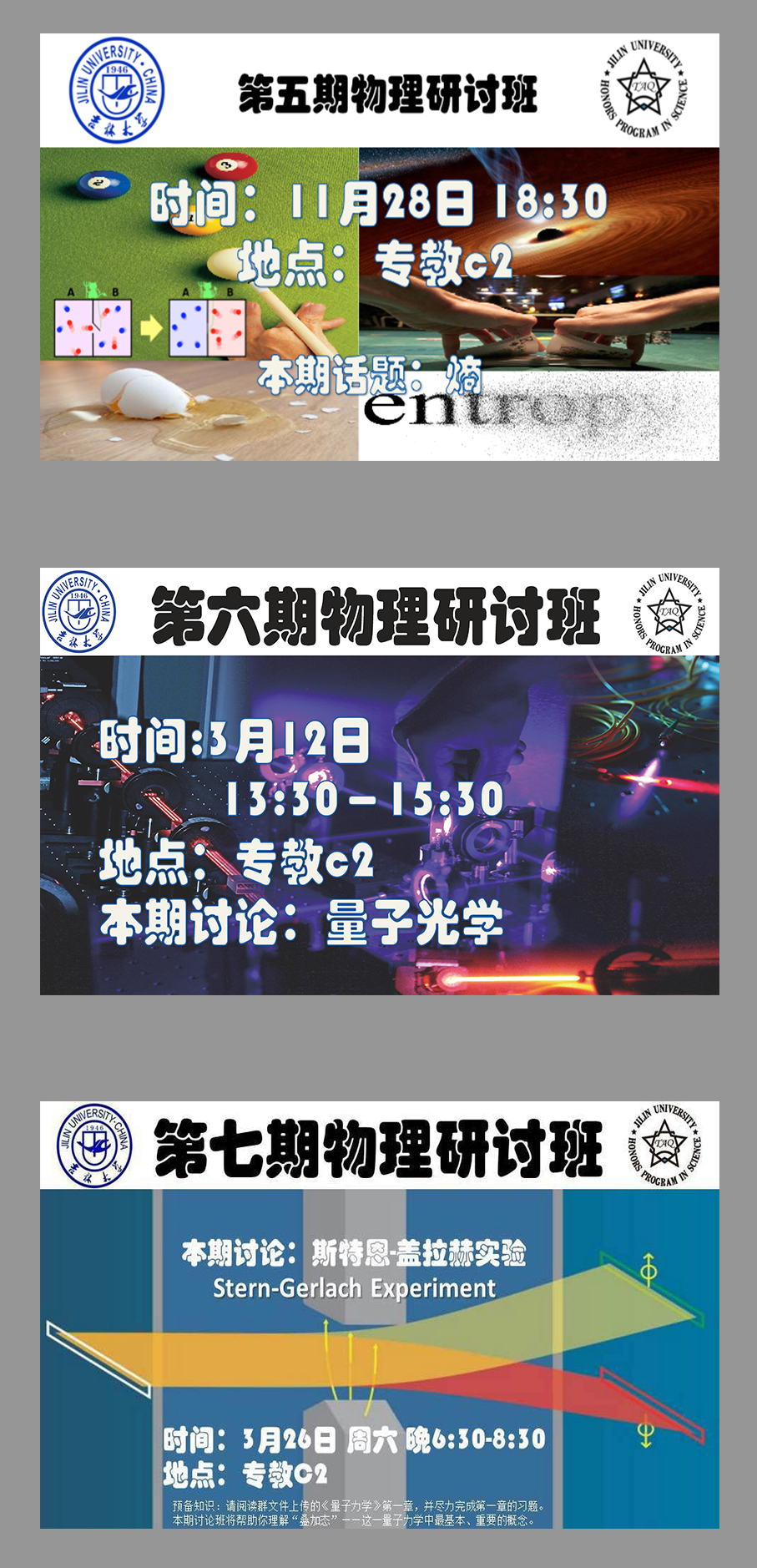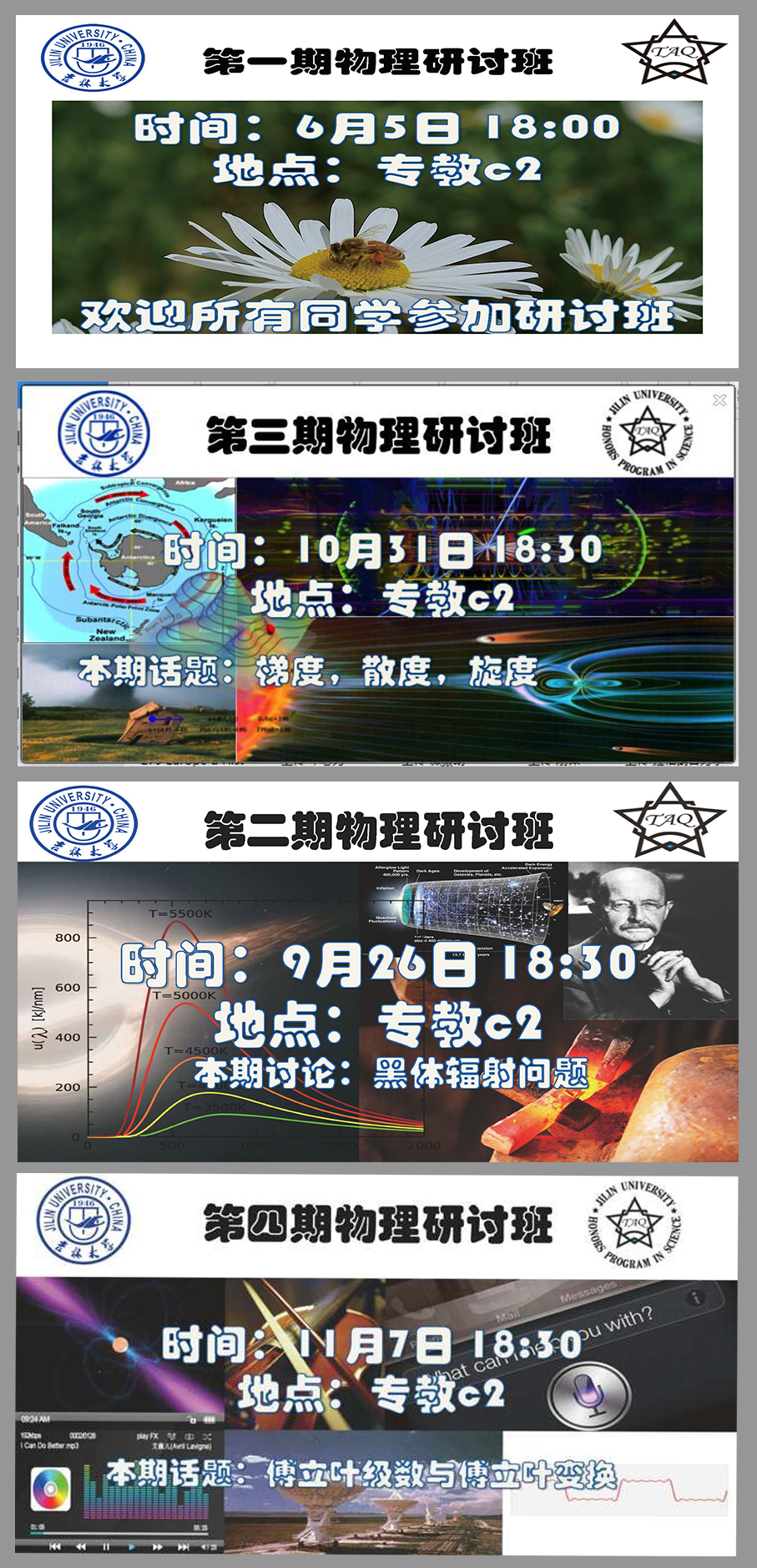物理研讨班”目前已举办了七期,内容涉及“玻色爱因斯坦凝聚”,“黑体辐射”,“梯度,旋度,散度”,“傅立叶级数与傅立叶变换”,“熵”,“量子光学(光与原子相互作用)”,“斯特恩-盖拉赫实验”等等,每期活动时长约为2个小时,得到了漫蛙