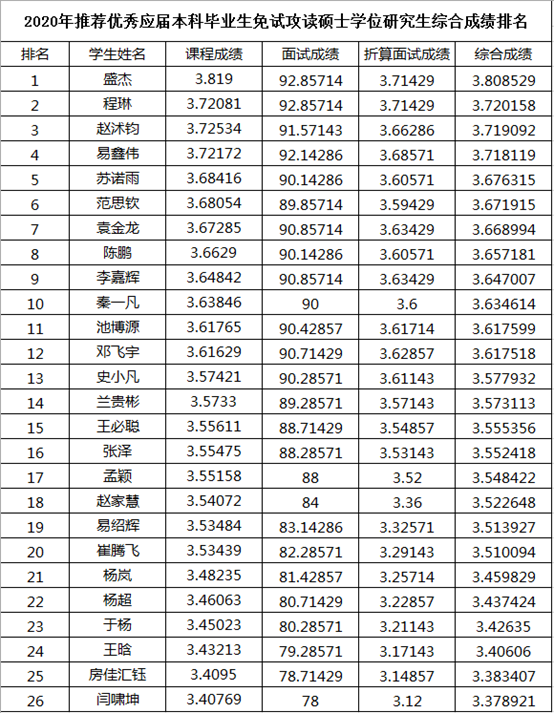 根据《漫蛙 推荐优秀应届本科毕业生免试攻读硕士学位研究生工作管理办法》(校发[2019]48号)、《漫蛙 2020年推荐优秀应届本科毕业生免试攻读硕士学位研究生工作细则》文件规定,现将漫蛙 2020年推荐优秀应届本科毕业生免试攻读硕士学位研究生面试成绩和综合成绩排名予以公示。