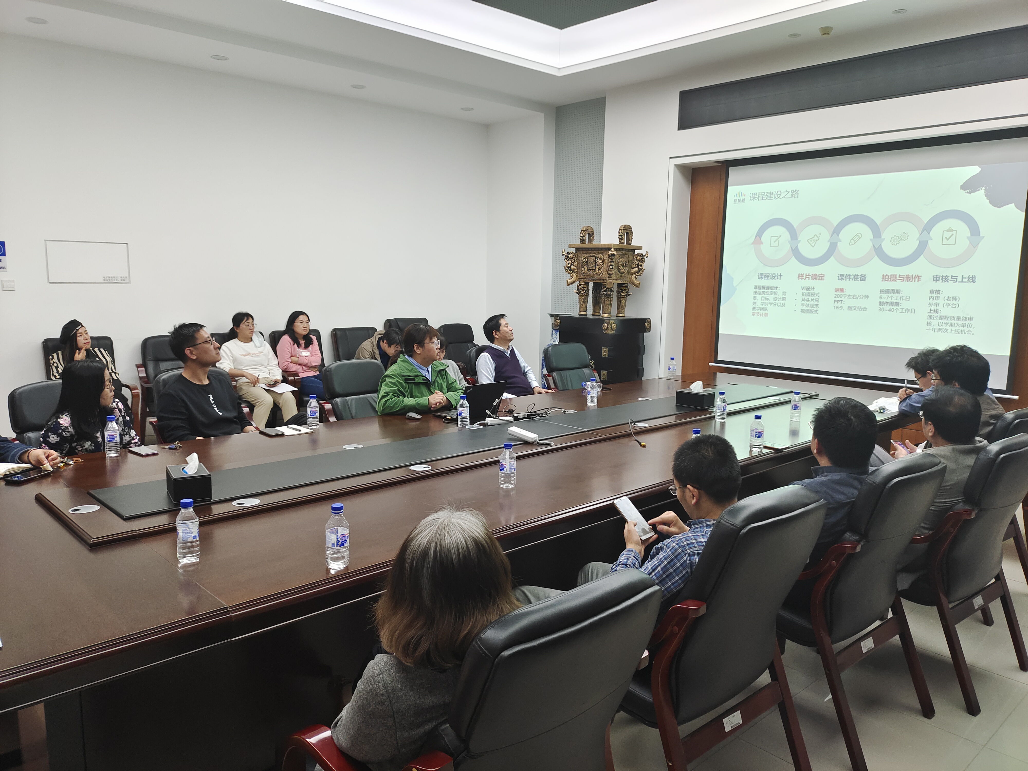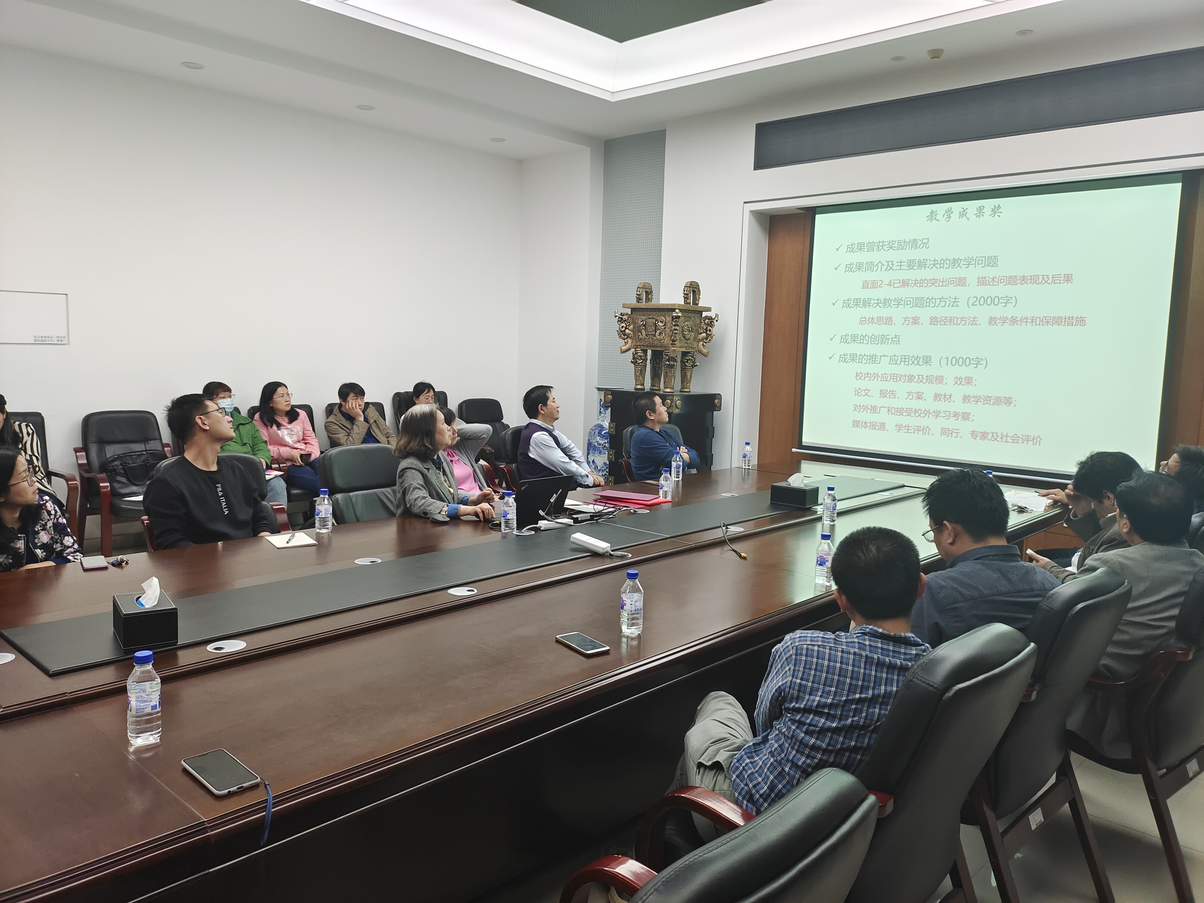 王海军副院长首先指出了各类教学奖项及项目的重要性,强调了“教学是长跑,功在平时”“好的教学更需要好的提炼和总结”等理念。随后,倪牟翠老师介绍了几种常见的教学类成果,并结合自己的经历谈了每种教学类成果的基本情况、申报资格和注意事项。她以学校教务处的相关通知中的申报流程和时间节点为主线,梳理了教学成果奖申报中可能遇到的问题以及方法、思路,提出准备材料要打好提前量。杨守文老师则以“课程建设调研汇报”为题,详细介绍了课程建设方面的各类项目的基本情况,梳理了每个项目中国家级、省级、校级的关系。此外,本次会议还邀请到了智慧树网的课程顾问,在在线开放课程开发与建设方面为学院教师分享了经验,并就可能遇到的问题展开了交流。