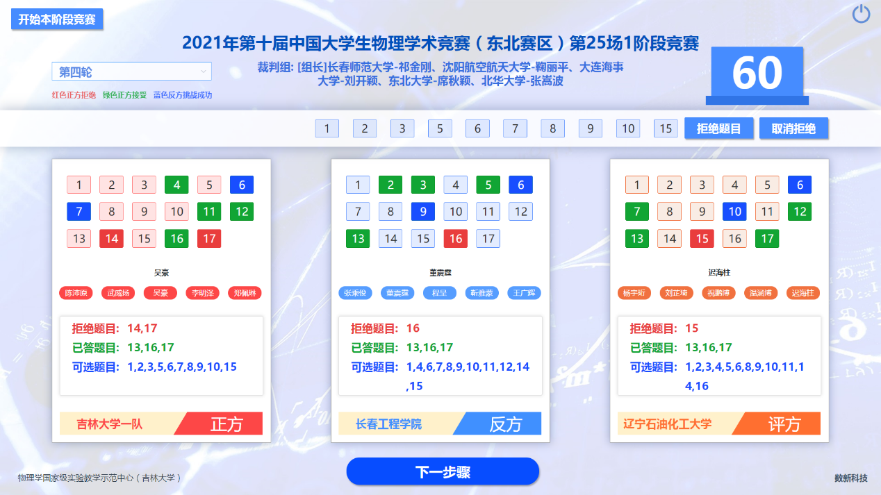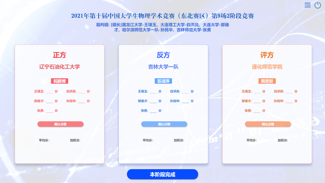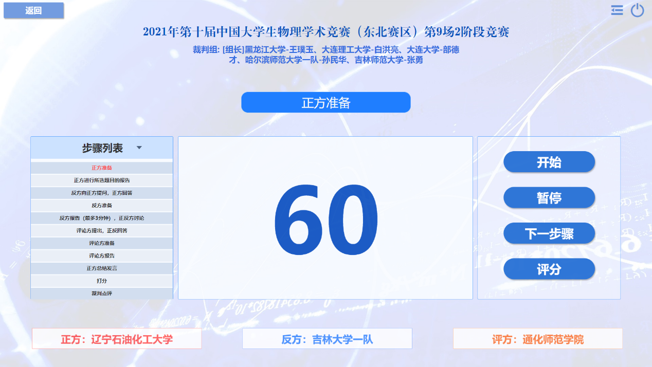 在为期两天的线上比赛中,共有来自东三省22所高校的24支代表队参赛。各参赛队综合物理理论、数学建模、实验设计及科学思辨等多项手段,针对17个公开题目(引自国际青年物理学家锦标赛IYPT)展开了近一年的研究探索,并以正、反方团队辩论的形式进行比赛。赛事分四轮,共有128名参赛选手和96场竞赛。为此,我院专门开发了一套竞赛系统,保障了赛事信息及时的统计、更新和发布,受到了各参赛队伍的好评。最后,经过激烈的角逐,漫蛙