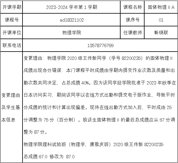 公示日期: 2024年_3月_21日至2024年_3月_27日,如有异议请于公示期内向教务处教学运行科反映。 联系人: 邹老师 联系电话: 0431-85168962 相关材料详见附件: 1.漫蛙 考核成绩复查、修改登记表 2.学院情况说明(学院教学委员会讨论通过、签字盖章) 3.试卷等相关佐证材料