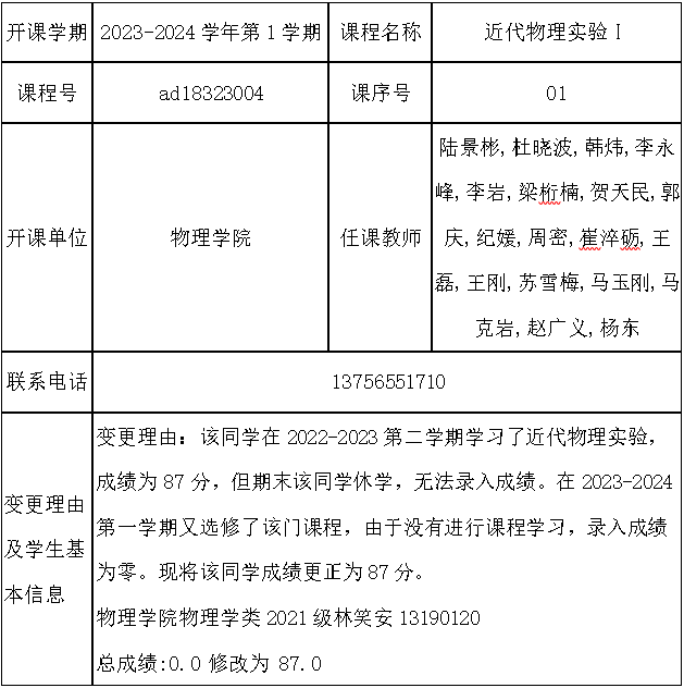 公示日期: 2024年_3月_21日至2024年_3月_27日,如有异议请于公示期内向教务处教学运行科反映。 联系人: 邹老师 联系电话: 0431-85168962 相关材料详见附件: 1.漫蛙 考核成绩复查、修改登记表 2.学院情况说明(学院教学委员会讨论通过、签字盖章) 3.试卷等相关佐证材料