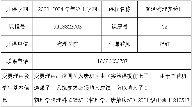 公示日期: 2024年_3月_25日至2024年_3月_29日,如有异议请于公示期内向教务处教学运行科反映。 联系人: 邹老师 联系电话: 0431-85168962 相关材料详见附件: 1.漫蛙 考核成绩复查、修改登记表 2.学院情况说明(学院教学委员会讨论通过、签字盖章) 3.试卷等相关佐证材料