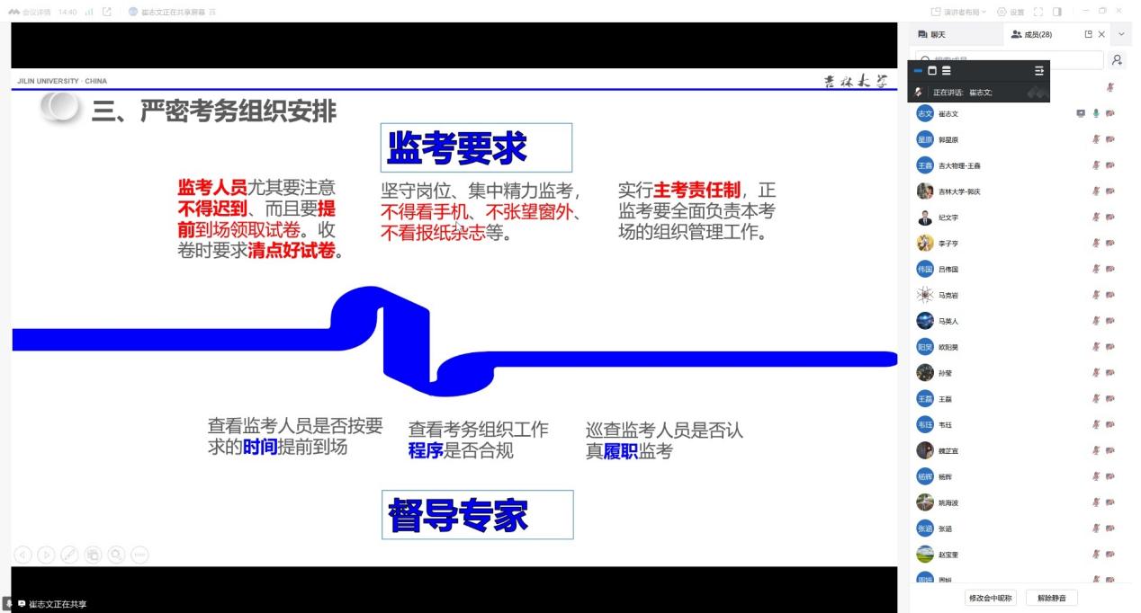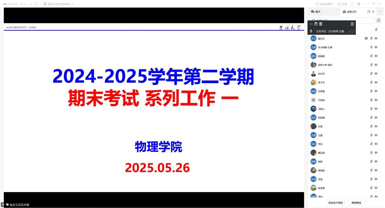 在线上召开了2024-2025学年第二学期期末考试考务工作会,校教学督导专家崔志文及学院本学期的全体命题和监考老师、教学秘书参加了本次会议。会议由教学副院长王鑫主持。