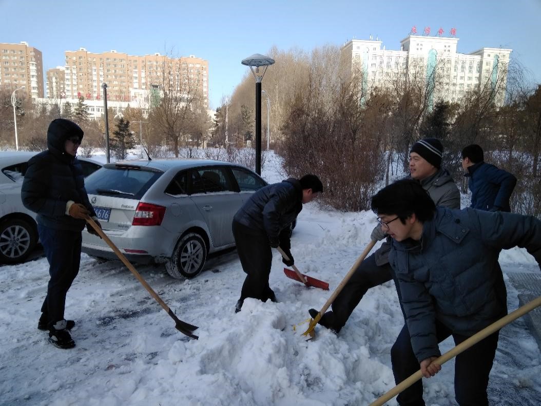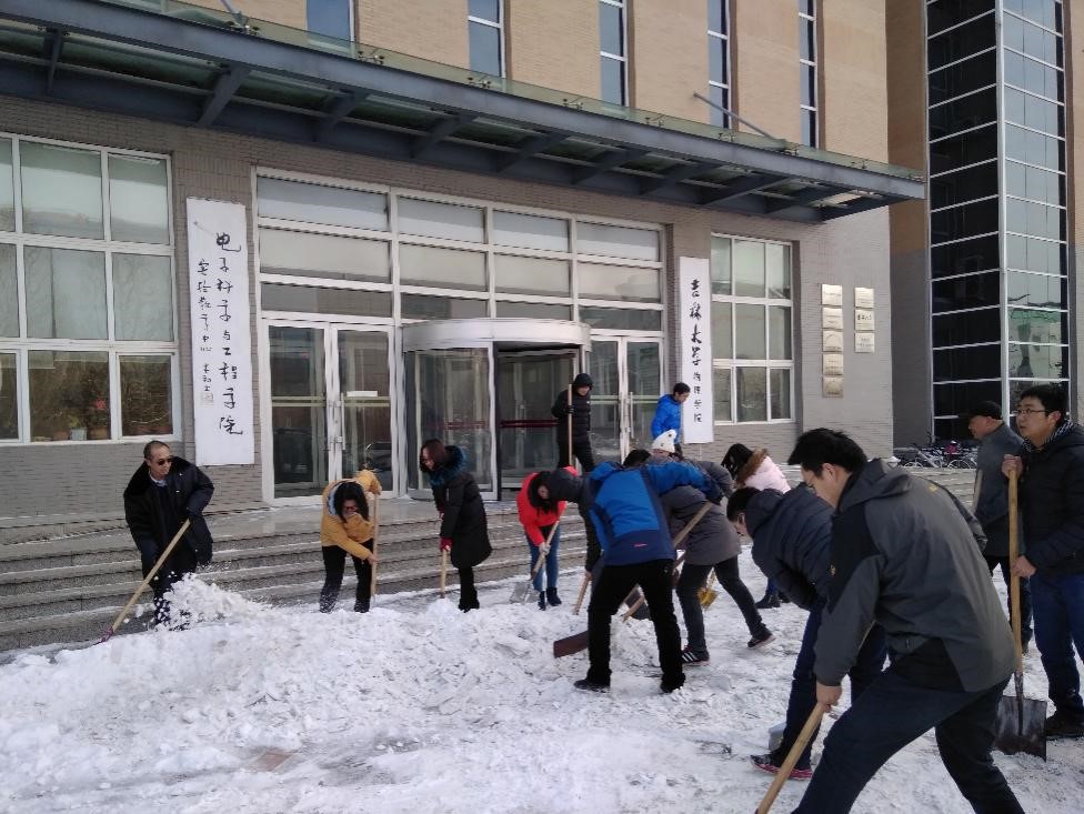 三十多名教师率领着各自的研究生,抗着铁锹、雪铲,放下手中繁忙的工作聚集到物理楼前开始清雪,清雪队伍的热情打破了校园里雪后的宁静。大家撸起袖子高喊着口号,齐心协力将雪推走、堆放在道路两旁,物理楼前呈现出一片沸腾的景象。俗话说下雪不冷化雪冷,但队伍中热火朝天的气氛赶走了这寒冷的天气,大家的额头上也渗出了滴滴汗珠,有的教师干得起兴更是摘掉了手套或帽子。